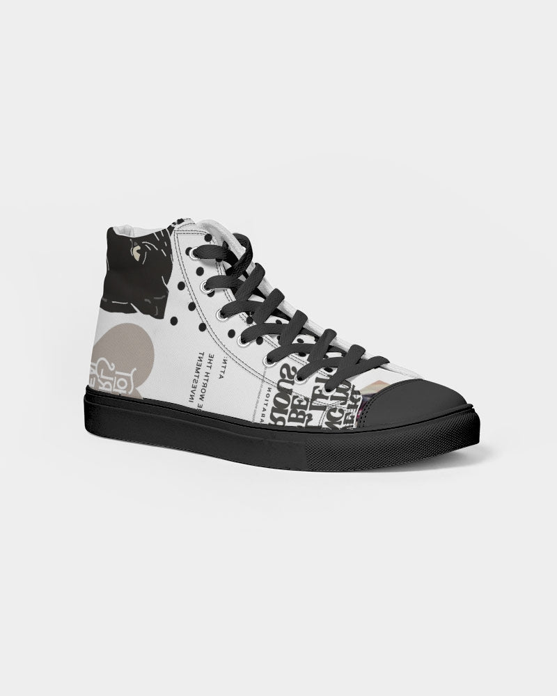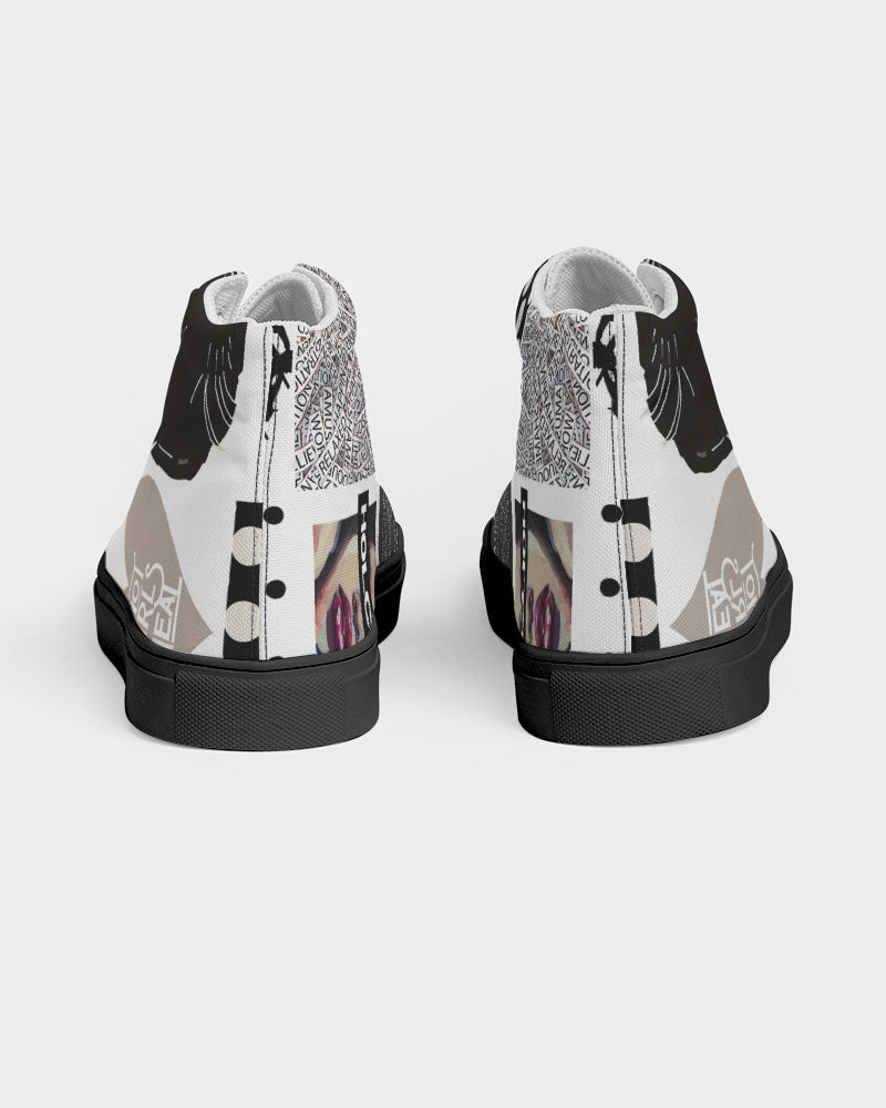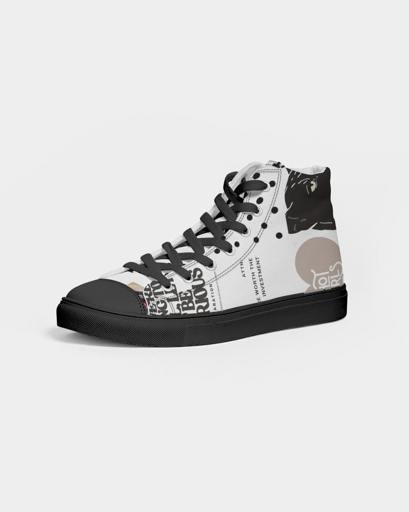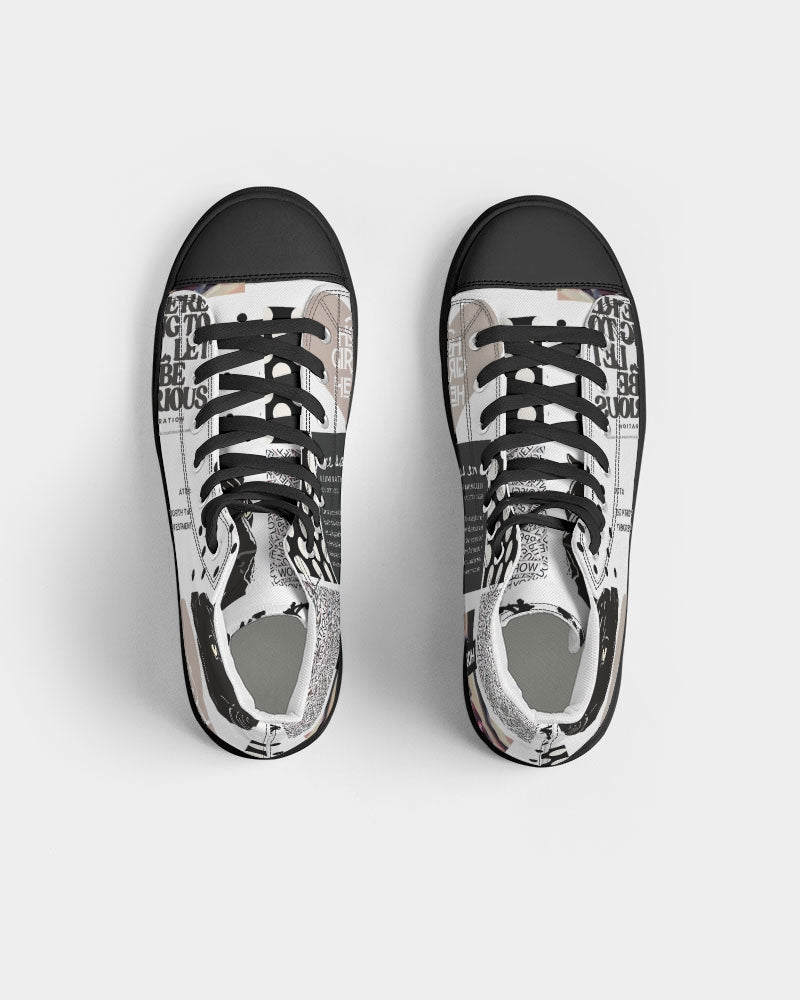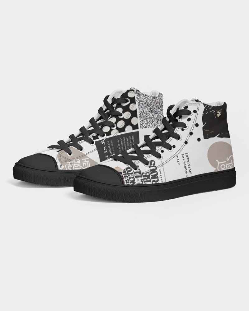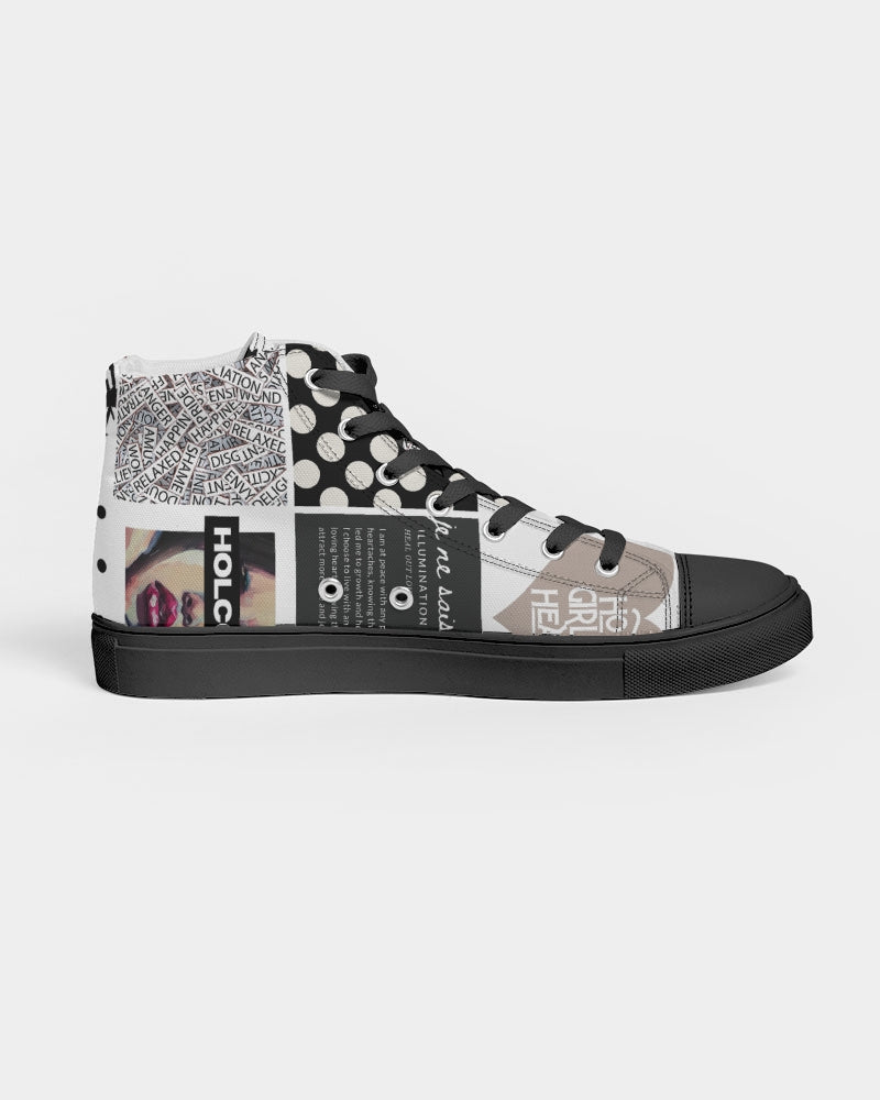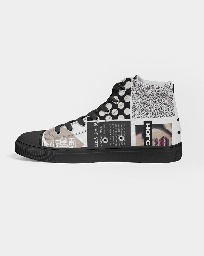 About The ArtPatched Up Patched up Product DetailsRock your custom made kicks on a trendy classic. Our Women's Hightop Canvas Shoe is a minimalist sneaker but gives comfort for a day or edgy night look.