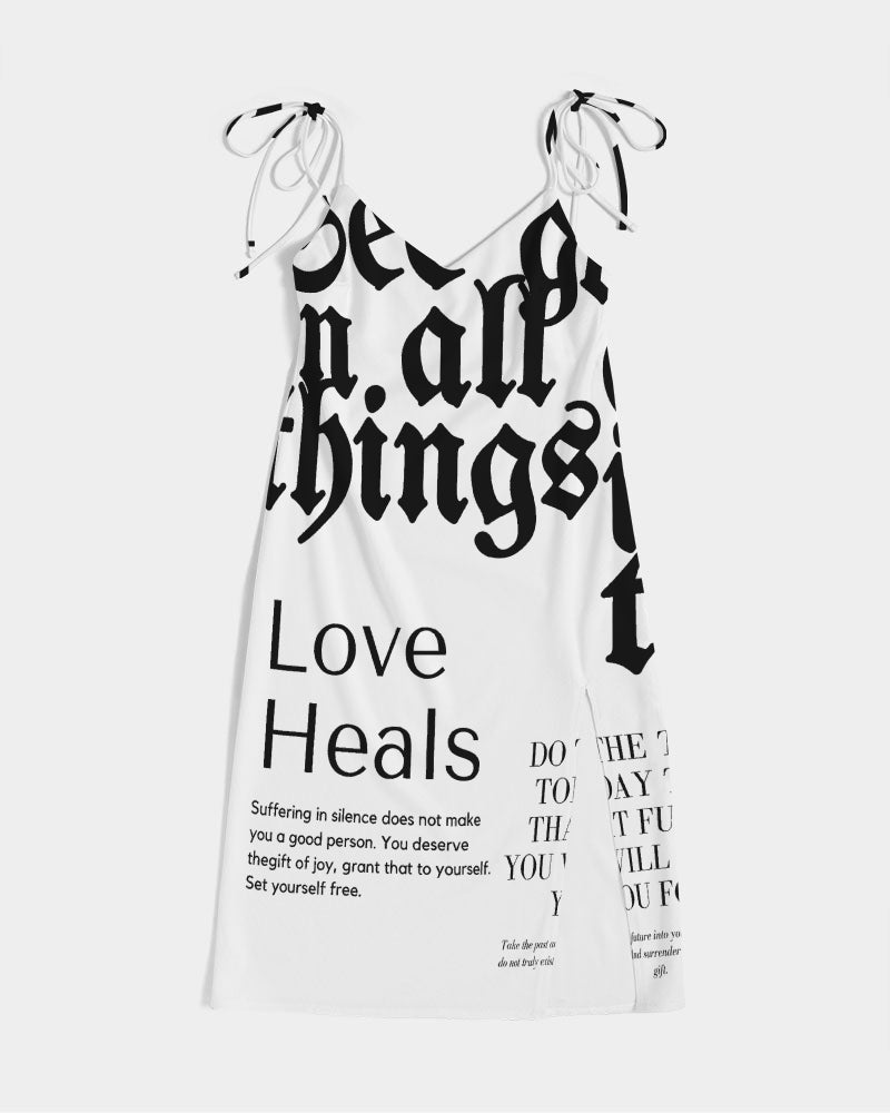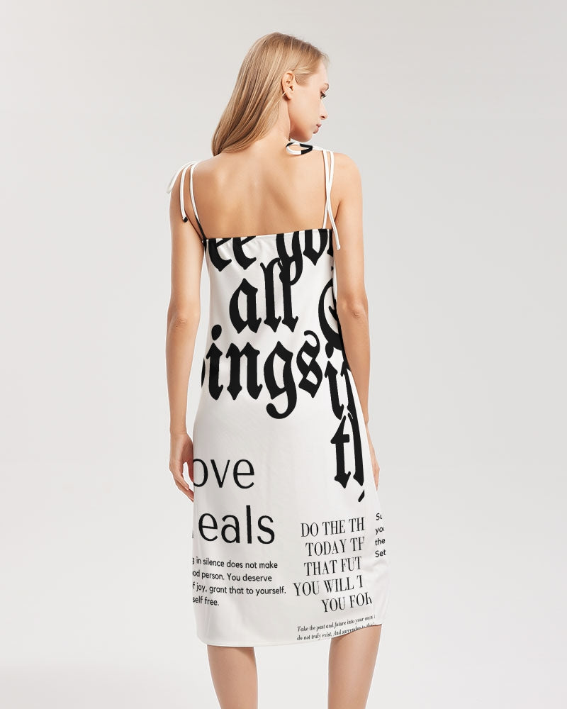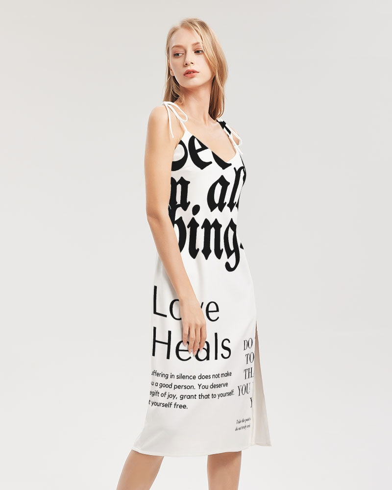 Product DetailsThis versatile and chic midi-length dress is the perfect piece for your day-to-night transitions. With tie close straps and front split, this dress will have all eyes on you.